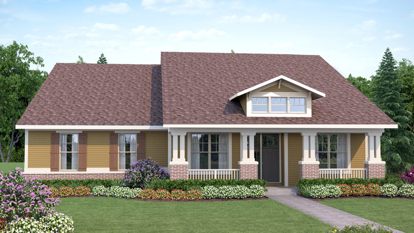Exterior rendering of 1 story home floor plan, Bushwood, Craftsman style Craftsman