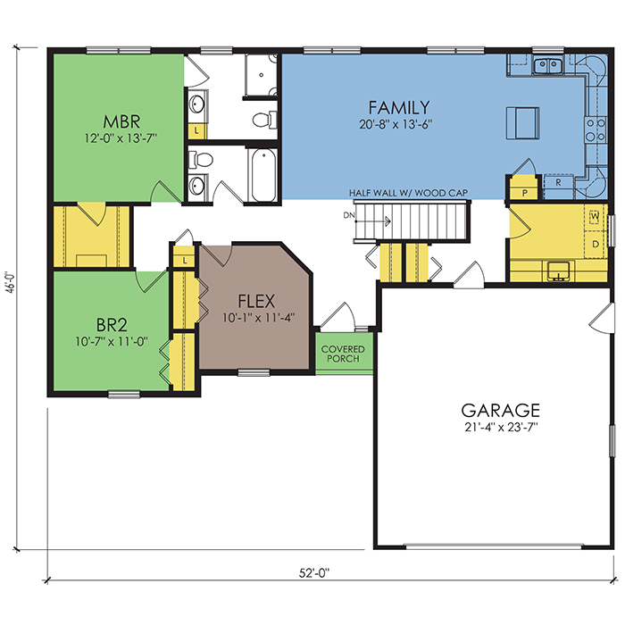 A part of our Wausau Originals, the Cleardale floor plan features 2 bedrooms and 2 bathrooms with a foot print of 52x46 feet and 1393 total square feet of living space. Floor Plan #WO206