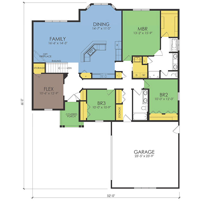 A part of our Wausau Originals, the Downey floor plan features 3 bedrooms and 2 bathrooms with a foot print of 52x66 feet and 1951 total square feet of living space. Floor Plan #WO416