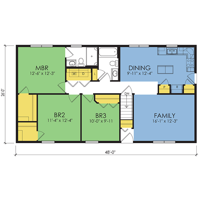 A part of our Wausau Originals, the Jackson floor plan features 3 bedrooms and 2 bathrooms with a foot print of 48x26 feet and 1248 total square feet of living space. Floor Plan #WO112