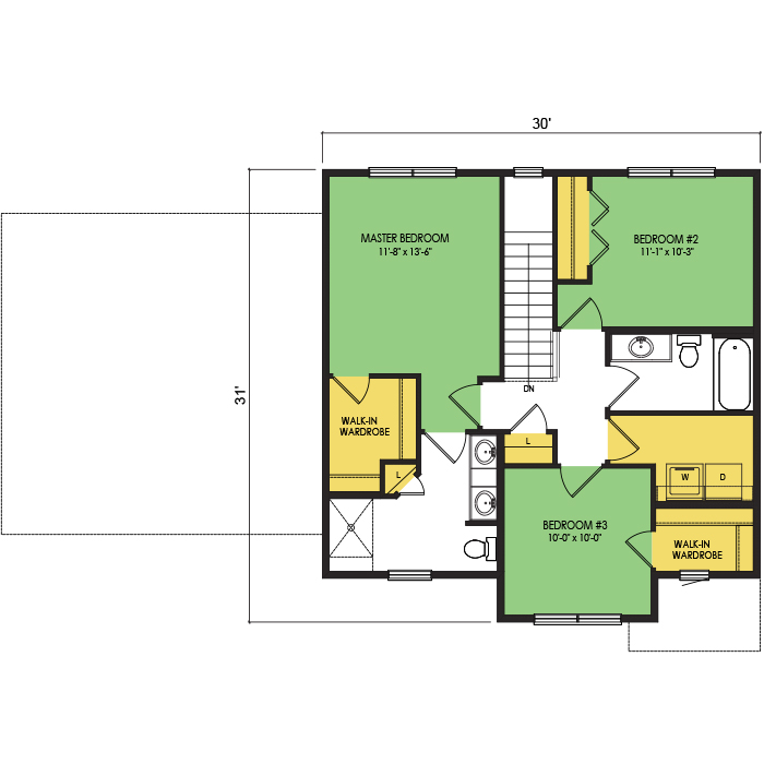 A part of our dream series, the tamarack floor plan features 3 bedrooms and 1.5 bathrooms with a foot print of 44x30 feet and 1342 total square feet of living space.